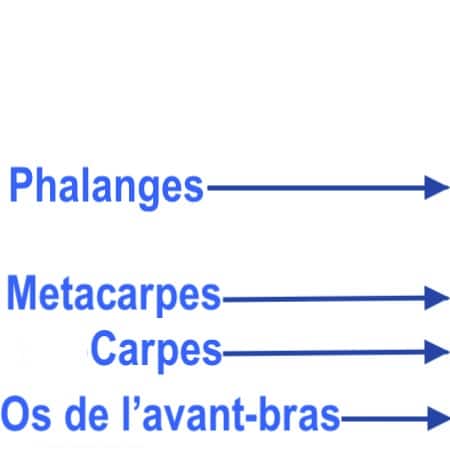 • les métacarpes (les premiers os long qui partent du poignet)